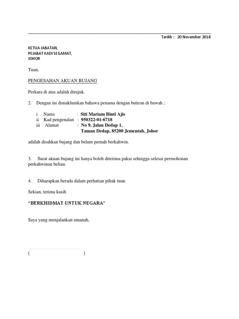 1 jalan cheras utama 3 taman cheras utama. Contoh surat akuan bujang daripada majikan have an image from the other contoh surat akuan bujang daripada majikan in addition it will include a picture of a kind that might be. Contoh surat rasmi akuan bujang frasmi.